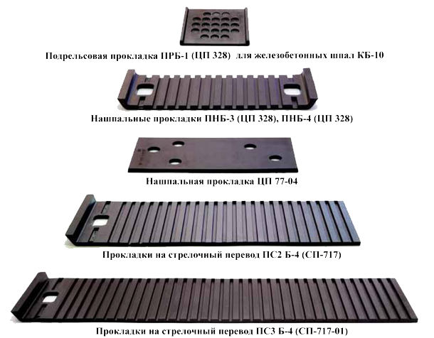 Призначення прокладок наступне. Їх встановлюють на залізобетонні або дерев'яні шпали, застосовують для приєднання рейок до бетону. Підкладка під рейку виготовлена з гуми перешкоджає зсуву рейок, значно знижує динамічні навантаження. Крім цього служить джерелом електроізоляції на шпалах.